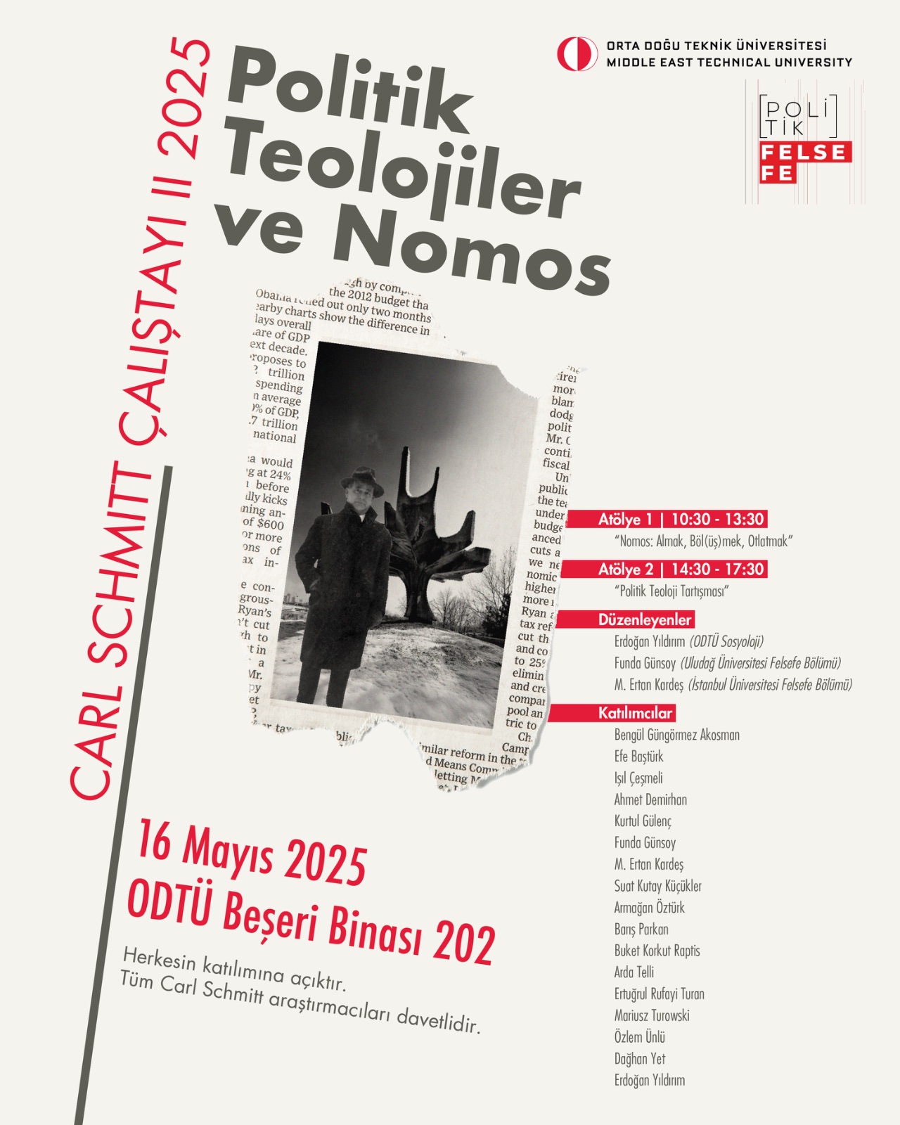 Bölümümüz hocalarından Erdoğan Yıldırım'ın düzenleyicileri arasında bulunduğu II. Carl Schmitt Çalıştayı, 16 Mayıs 2025 tarihinde Beşeri Bilimler Binası B202 numaralı seminer odasında gerçekleştirilecektir.
